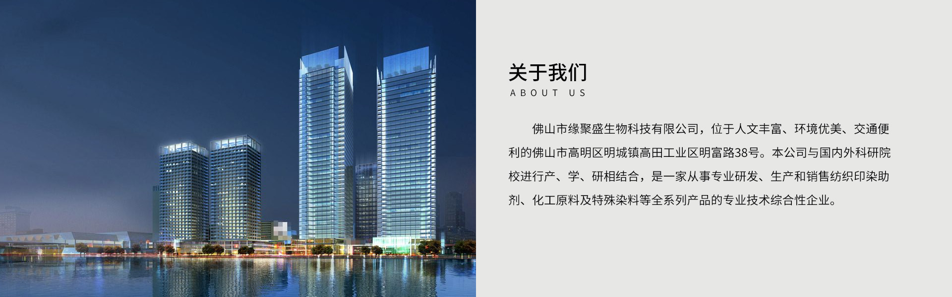 佛山市緣聚盛生物科技有限公司 網站正式上線! 本公司與國內外科研院校進行產、學、研相結合,是一家從事專業(yè)研發(fā)、生產和銷售紡織印染助劑、化工原料及特殊染料等全系列產品的專業(yè)技術綜合性企業(yè)。 熱誠歡迎各界朋友前來參觀、考察、洽談業(yè)務,歡迎新老客戶來電咨詢,佛山市緣聚盛生物科技有限公司全體成員歡迎您!